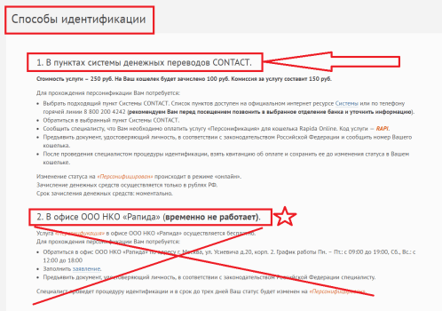 Зато доступен другой способ персонификации. Но для него потребуется, во-первых, 250 рублей (100 из них будут зачислены на ваш кошелёк рапида, так что стоимость услуги 150 рублей), во-вторых, пункт системы денежных переводов CONTACT. Приходим в пункт, заказываем оплату услуги «Персонификация» для кошелька рапиды. (Может понадобиться код услуги – запомните или запишите – RAPI). Предъявляем паспорт, оплачиваем, а квитанцию об оплате на всякий случай сохраняем. Вскоре ваш статус сменится на «персонифицирован».
