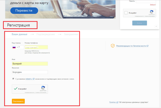 Обратите внимание, рядом с этой кнопкой текст «Создайте кошелек, просто привязав его к номеру вашего мобильного телефона» – так что телефон держите наготове. Далее, вводим действующий номер телефона, пишем свои реальные имя и фамилию, знакомимся с договором оферты, ставим галочку, что вы не робот и ждём смс с кодом подтверждения Rapida online регистрация